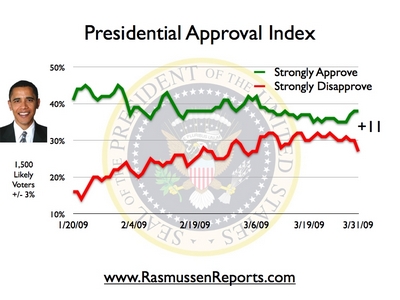President Barack Obama's Presidential Approval Index, as tracked by RasmussenReports.com, shows a double-digit figure. He had been as low as 4-5 and had been moving up.